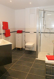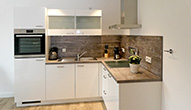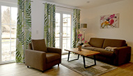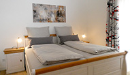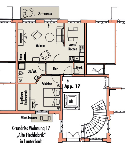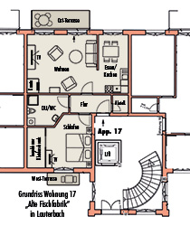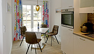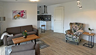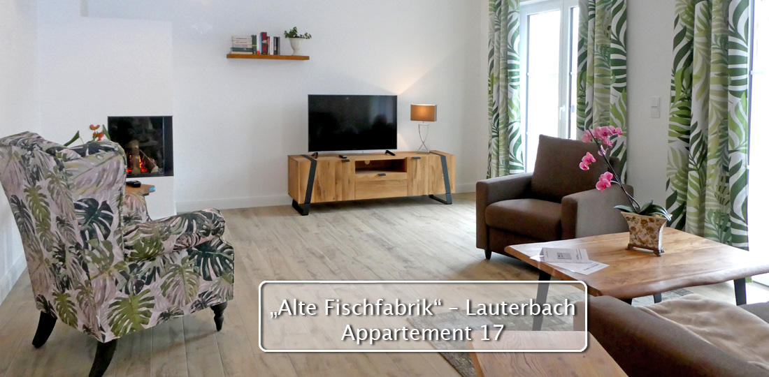Das Appartement 17 im Erdgeschoss ist mit Liebe zum Detail, hell und gemütlich eingerichtet – hier werden Sie sich rundum wohlfühlen. Es verfügt auf 65 qm über ein Schlafzimmer mit Doppelbett und TV, ein Wohnzimmer mit Kabel-TV, eine Küche sowie ein Bad. Ein Gaskamin sorgt in kalten Wintertagen für eine angenehme Wärme. Im Wohnzimmer befindet sich eine Schlafcouch mit Bettfunktion. Die ausgestattet ist mit einem Lattenrost und einer Matratze, so dass Sie hier wunderbar schlafen können. Die gut ausgestattete Küche verfügt über einen Herd mit 4 Kochfeldern, Kühlschrank mit Gefrierfach, Geschirrspüler, Kaffeemaschine, Toaster. Die Fewo hat eine ca. 24 qm große Terrasse zum Osten und eine kleine Terrasse zum Westen, damit Sie die Abendsonne geniessen können – beide Terrassen sind mit hochwertigen Gartenmöbeln ausgestattet.