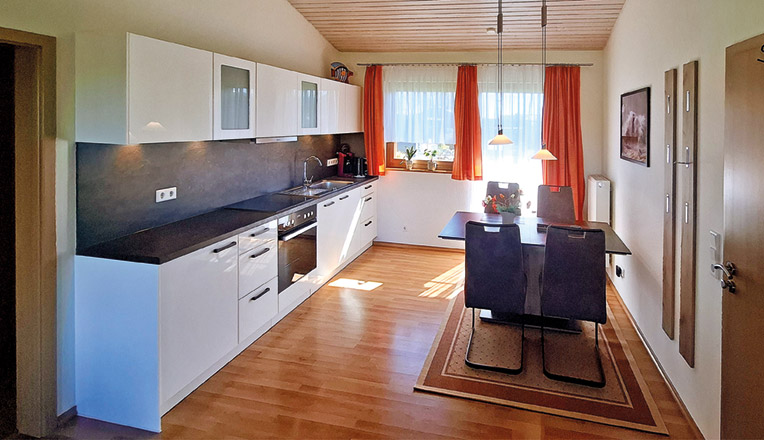 • komplett eingerichtete Küche mit Geschirrspüler, Ceranfeld, Backofen, Kühlschrank